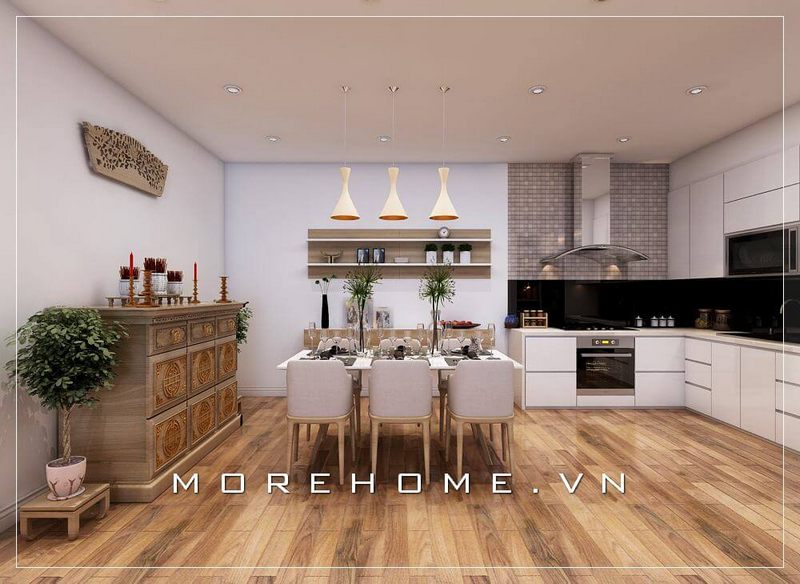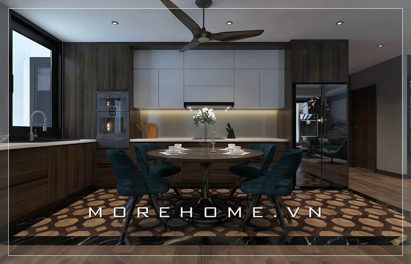 Phong cách thiết kế nội thất bếp hiện đại,màu sắc hài hòa. Thiết kế phòng ăn cũng rất sáng tạo và ấn tượng từ việc lựa chọn tủ bếp hiện đại, bàn ghế đến trang trí các tranh canvas treo tường rất cuốn hút.