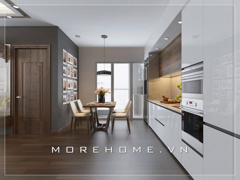 Mẫu tủ bếp gỗ công nghiệp màu trắng đơn giản và hiện đại cho phòng bếp chung cư