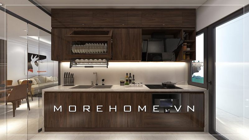 Thiết kế phòng bếp chung cư đẹp với hệ tủ bếp gỗ tự nhiên cao cấp mang đến không gian nấu ăn lí tưởng cho các chi em nội trợ.