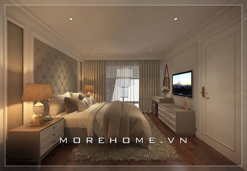 Bố trí nội thất phòng ngủ chung cư hiện đại, hợp lí từ giường ngủ, tap đầu giường, kệ tủ ti vi, bàn trang điểm... tất cả tạo nên một không gian nghỉ ngơi thoải mái mà không kém phần sang trọng