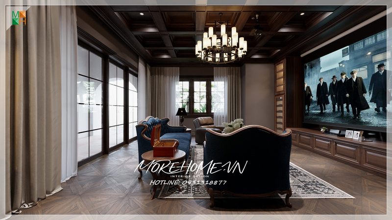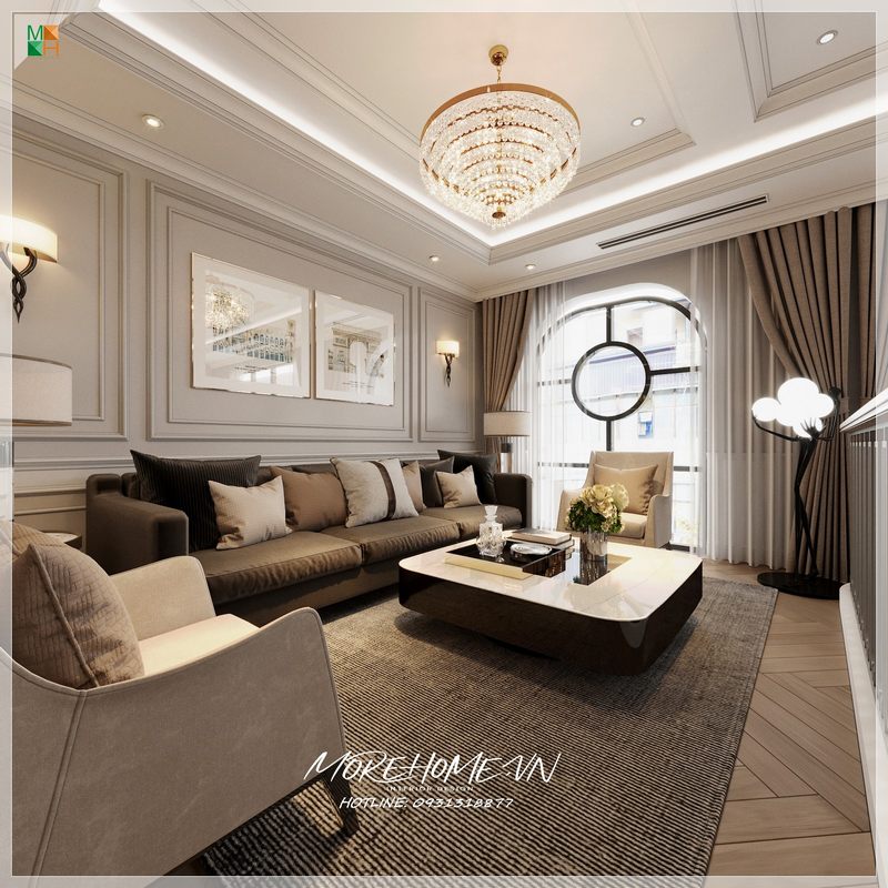 Bộ bàn ghế sofa gỗ óc chó tân cổ điển được làm từ chất liệu nhung vàng ánh, mang lại sự hút mắt và đặc biệt hơn nữa là tạo nên một điểm nhấn ấn tượng cho phòng khách chung cư thông tầng.