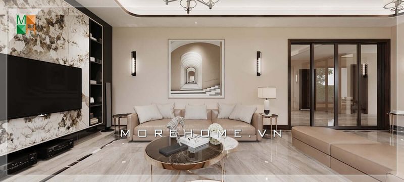 Mẫu thiết kế bàn trà chân kim loại mạ vàng kết hợp với mặt bàn đá nhân tạo cao cấp giúp tăng cường sự hiện đại và sang trọng của phòng khách.