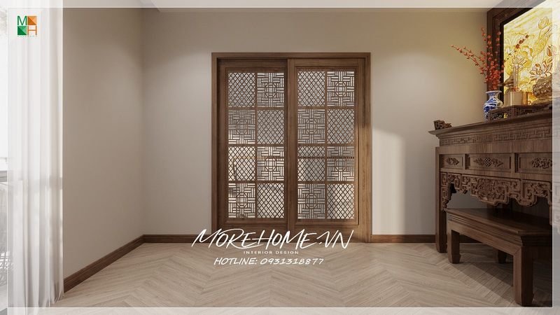 Cửa gỗ trượt của phòng thờ được trang trí đơn giản bằng các hoa văn phù hợp với không gian.