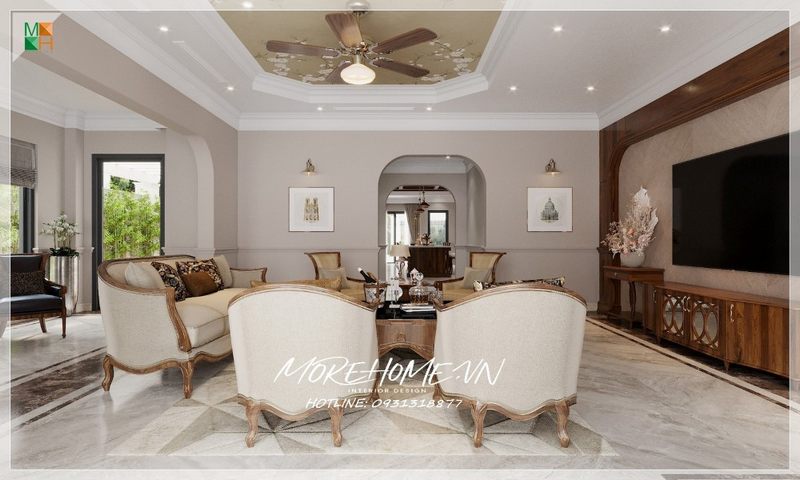 Phòng khách được thiết kế bằng đá nhân tạo tạo nên một bức tranh sang trọng.